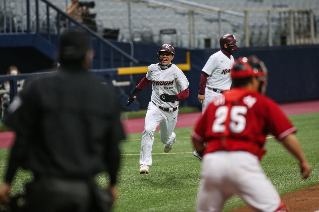| ▲  Song Sung-mun of the Kiwoom Heroes scores against the SSG Landers in the bottom of the sixth inning of a Korea Baseball Organization preseason game at Gocheok Sky Dome in Seoul on March 17, 2022, in this photo provided by the Heroes. (PHOTO NOT FOR SALE) (Yonhap) |