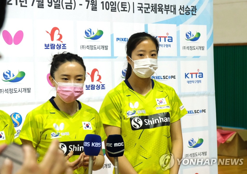 | ▲ South Korean table tennis players Shin Yu-bin (R) and Jeon Ji-hee speak to reporters ahead of an Olympic prep competition in Mungyeong, North Gyeongsang Province, on June 21, 2021. (Yonhap) |