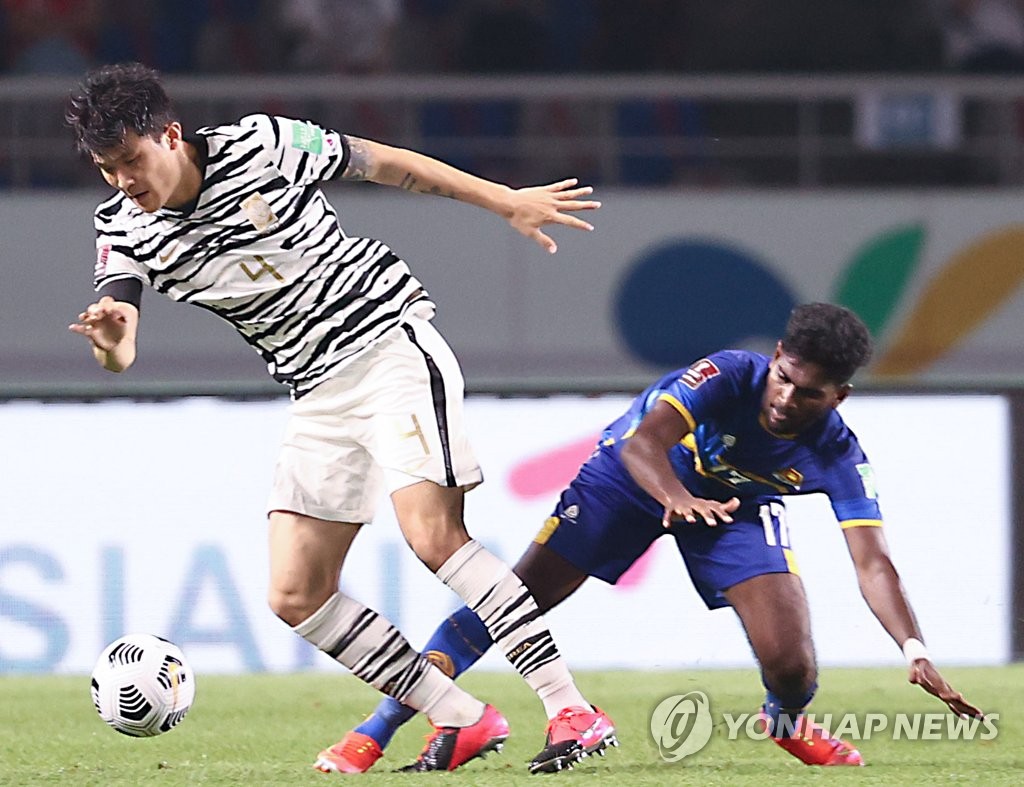 ▲ In this file photo from June 9, 2021, Kim Min-jae of South Korea (L) dribbles past Jude Supan of Sri Lanka during the teams' Group H match in the second round of the Asian qualification for the 2022 FIFA World Cup at Goyang Stadium in Goyang, Gyeonggi Province. (Yonhap)