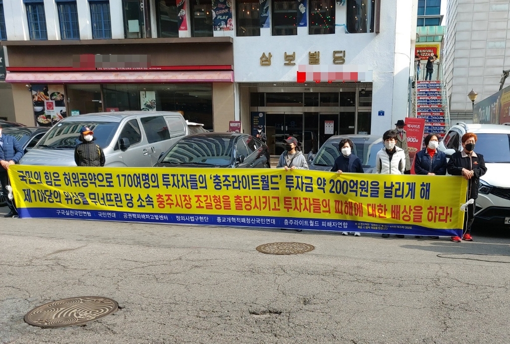 라이트월드 투자자 20여명은 이날 오전 서울 여의도 국민의힘 당사 맞은편에서 '조길형 충주시장 규탄 집회'를 열었다.