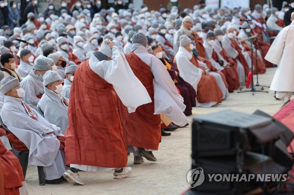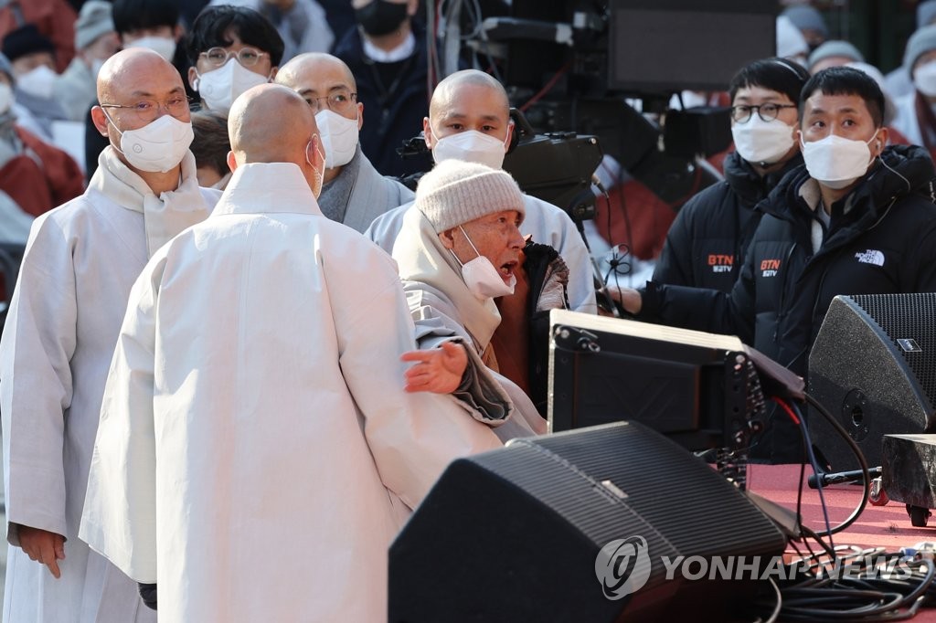 | ▲ 송영길 사과 입장 반발하며 자리 떠나는 승려들 (서울=연합뉴스) 임화영 기자 = 21일 오후 서울 종로구 조계사에서 열린 대규모 승려대회에서 참가자들이 더불어민주당 송영길 대표의 사과 입장 발표에 반발하며 자리를 떠나고 있다. 이날 열린 대규모 승려대회에서는 더불어민주당 정청래 의원의 문화재관람료 비하 발언, 정부의 천주교 캐럴캠페인 지원 등 현 정부에서 벌어진 종교편향·불교왜곡 사례를 비판하며 전국 사찰에서 최대 5천명가량의 승려들이 참석했다. 2022.1.21 hwayoung7@gmail.com |