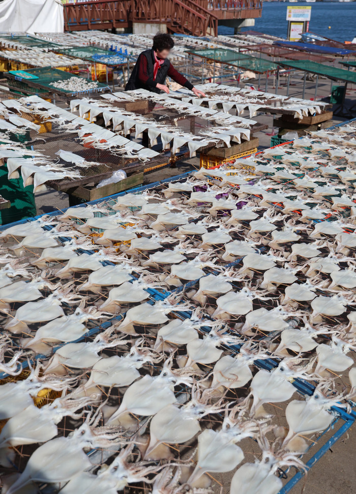 A resident spreads squid to dry at a fish market in the southeastern port city of Busan on Feb. 3, 2025. Dried squid is a popular South Korean food. (Yonhap)