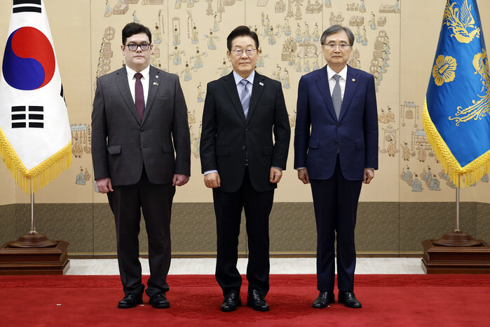 President Lee Jae Myung (C) poses for a photo with new Bangladeshi Ambassador to South Korea Toufiq Islam Shatil (L) during a ceremony to receive the envoy's credentials at the presidential office in Seoul on Sept. 2, 2025. On the right is Foreign Minister Cho Hyun. (Pool photo) (Yonhap)
