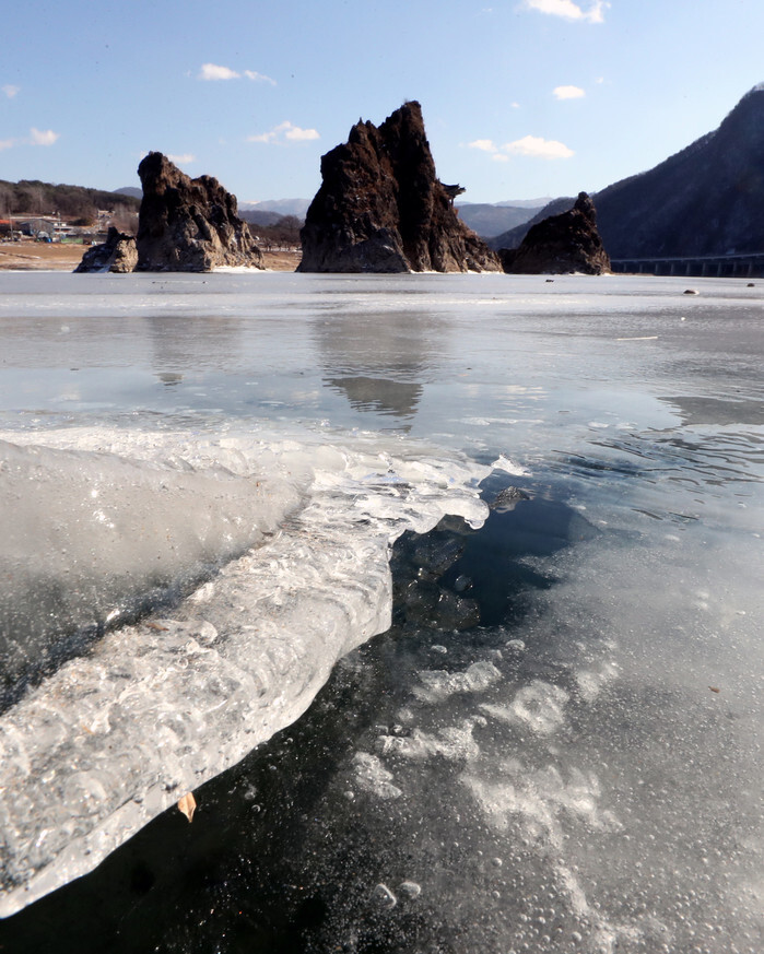 The Namhan River is frozen near Dodam Sambong, or the Three Peaks of Dodam, in Danyang, North Chungcheong Province, central South Korea, on Jan. 13, 2026, amid a cold snap gripping the country. (Yonhap)