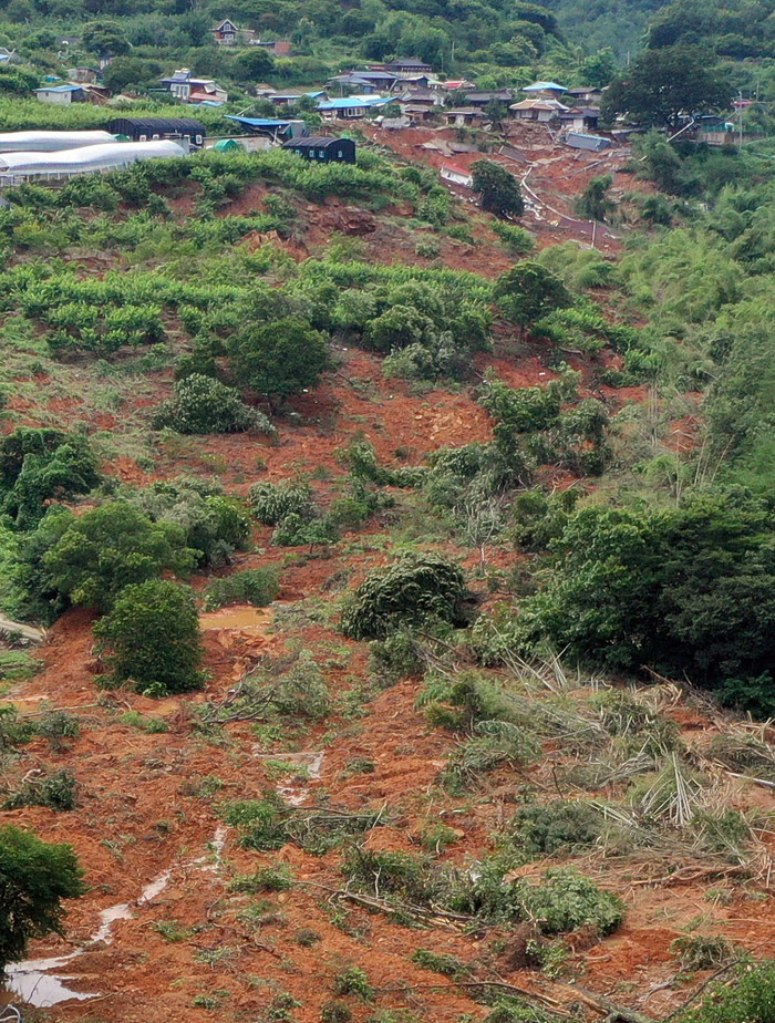 A village is left buried on the slope of a mountain in Sancheong, South Gyeongsang Province, southeastern South Korea, on July 21, 2025, after it was hit by a landslide following heavy rainfall. (Yonhap)