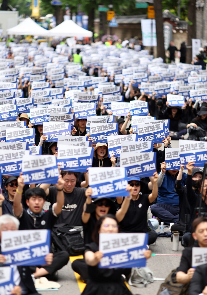 People take part in a rally calling for the protection of teachers' rights near the government complex in central Seoul on June 14, 2025, after the death of a Jeju middle school teacher in May, who endured repeated complaints from a student's family. (Yonhap)