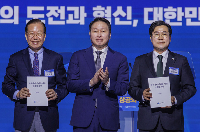Chey Tae-won (C), chief of the Korea Chamber of Commerce and Industry (KCCI), poses for a photo with Kwon Young-se (L), chief of the ruling People Power Party's emergency leadership committee, and Park Chan-dae, floor leader of the main opposition Democratic Party, after presenting the business circle's proposal documents on the South Korean economy during a ceremony to mark the 52nd Commerce and Industry Day at the KCCI headquarters in Seoul on March 19, 2025. (Yonhap)