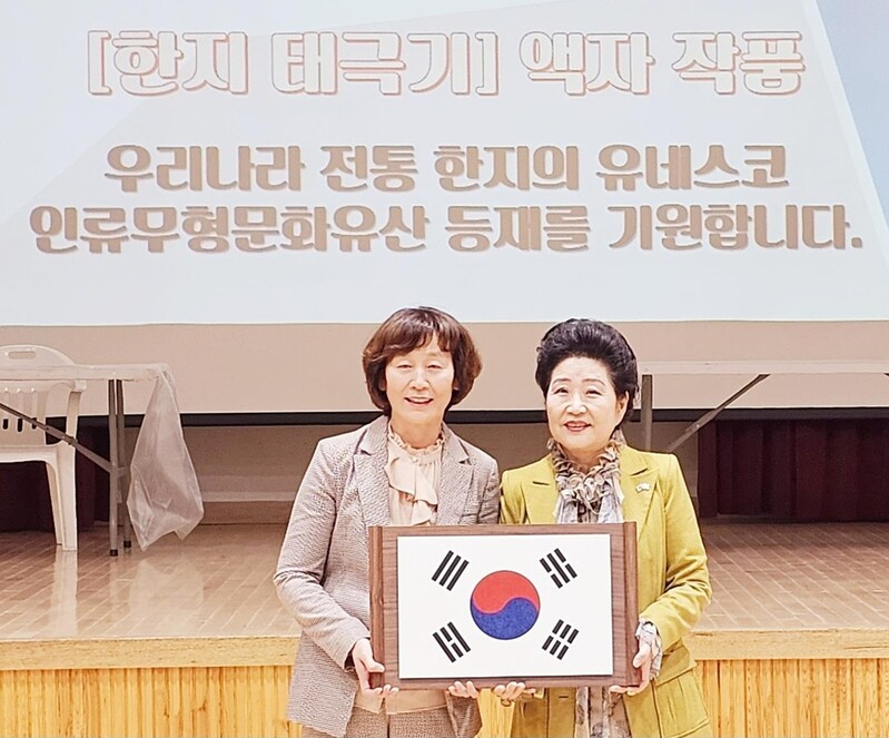 | ▲ 한지 유네스코 문화유산 등재 기원 '태극기' 액자 증정 행사에서는 전통 한지의 유네스코 인류무형문화유산 등재를 기원하는 뜻을 담아 '한지 태극기' 액자 작품을 노영혜(사진 우측) 종이문화재단 이사장이 김은숙 동내초등학교 교장에게 증정했다. [종이문화재단 제공] |