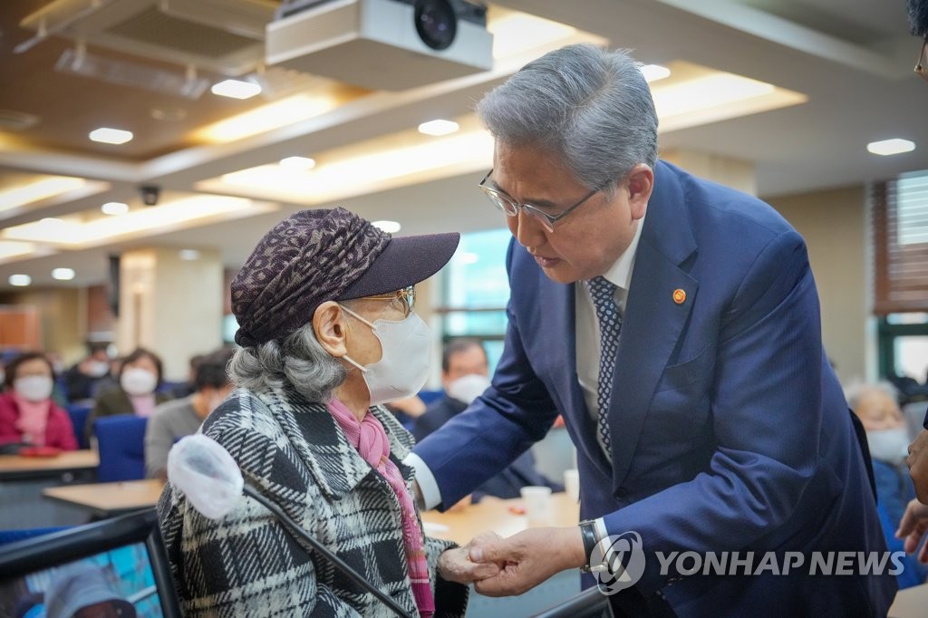 | ▲ Foreign Minister Park Jin (R) talks with a relative of a victim of Japan's wartime forced labor in Seoul on Feb. 28, 2023, in this photo provided by the ministry. He met with the families to update them on the state of government consultations with Tokyo to resolve the issue of compensating the victims. (PHOTO NOT FOR SALE) (Yonhap) |
