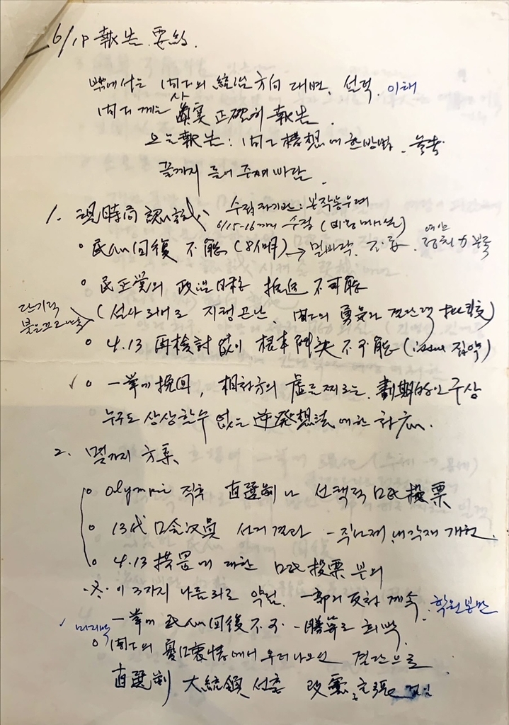 | ▲ 김용갑 전 장관 자필 메모 '보고' 중 일부 1987년 6월 21∼25일에 쓴 내용 [대한민국역사박물관 제공. 재판매 및 DB 금지] |