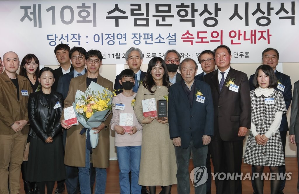 | ▲ 제10회 수림문학상 시상식 (서울=연합뉴스) 진성철 기자 = 24일 서울 종로구 연합뉴스 사옥에서 열린 수림문학상 시상식에서 수상자인 이정연 소설가(가운데)가 최규학 수림문화재단 이사장, 성기홍 연합뉴스 사장 등 참석자들과 함께 기념 촬영을 하고 있다. 연합뉴스와 수림문화재단은 이정연의 장편소설 '속도의 안내자'를 수림문학상 제10회 당선작으로 선정했다. 2022.11.24 zjin@yna.co.kr |