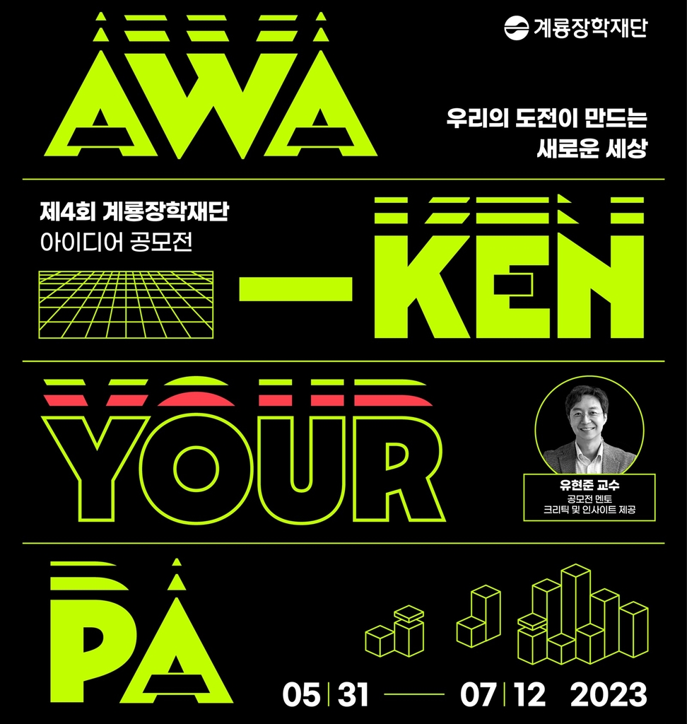 (대전=연합뉴스) 이은파 기자 = 계룡장학재단은 'AWAKEN YOUR PASSION - 우리의 도전이 만드는 새로운 세상'이란 슬로건으로 31일부터 7월 12일까지 '제4회 아이디어 공모전'을 개최한다고 밝혔다.
