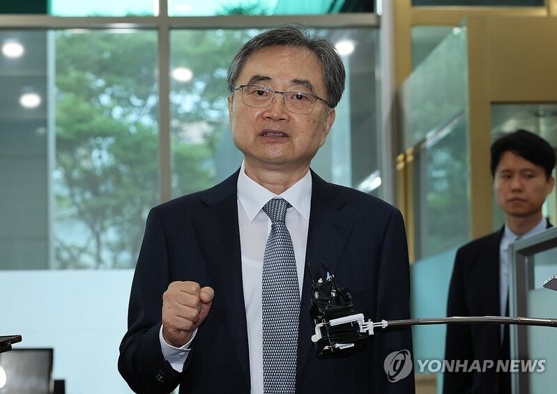 | ▲ South Korea's new Foreign Minister Cho Hyun speaks to reporters ahead of his inauguration at the foreign ministry in Seoul on July 21, 2025. (Yonhap) |