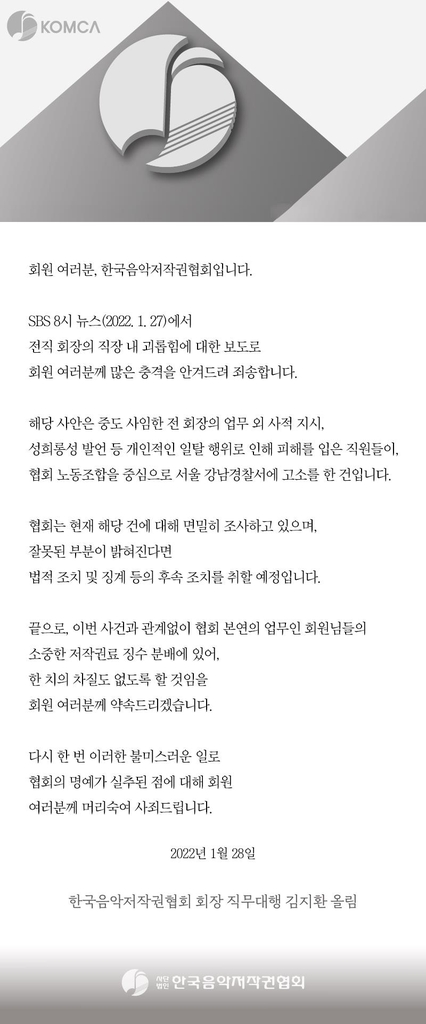협회는 작사·작곡가들의 음악 저작권을 관리하는 협회 업무와 관련해 "이번 사건과 관계없이 협회 본연의 업무인 회원들의 소중한 저작권료 징수 분배에 있어 한 치의 차질도 없도록 할 것임을 약속드리겠다"고 밝혔다.