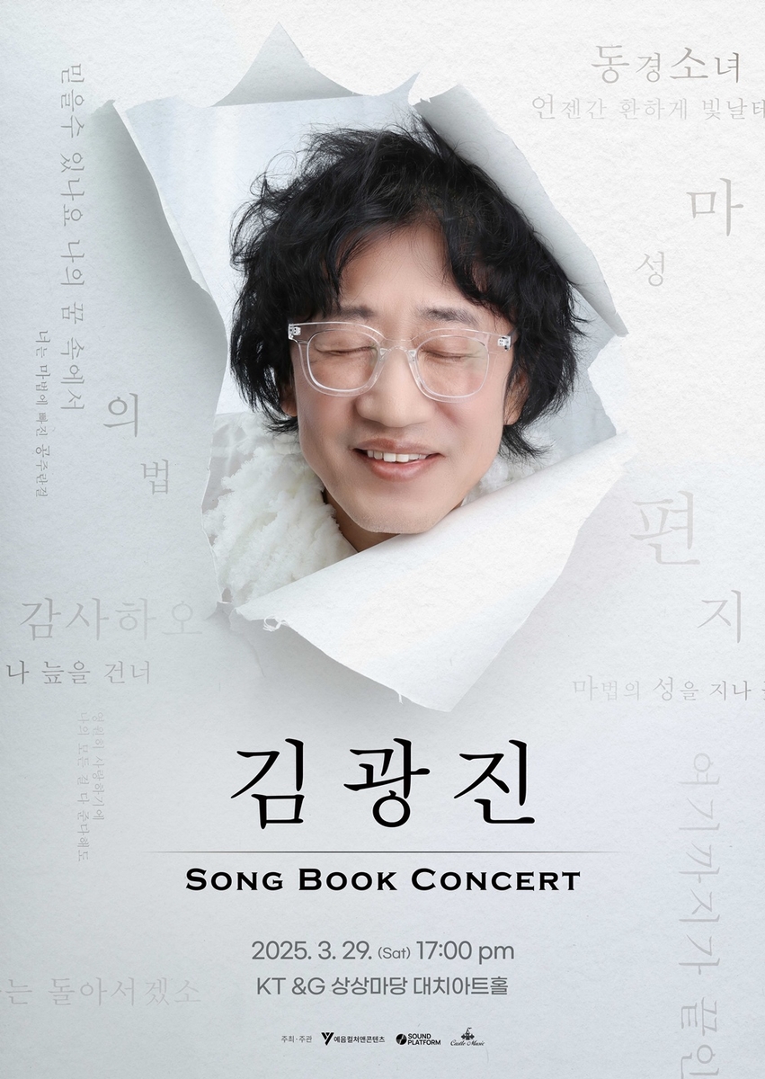 ▲ 김광진 '송 북 콘서트' = '마법의 성'과 '편지' 등으로 잘 알려진 싱어송라이터 김광진이 다음 달 29일 오후 5시 서울 KT&G 상상마당 대치아트홀에서 '송 북(Song Book) 콘서트'를 연다고 주최사 예음컬처앤콘텐츠가 밝혔다.