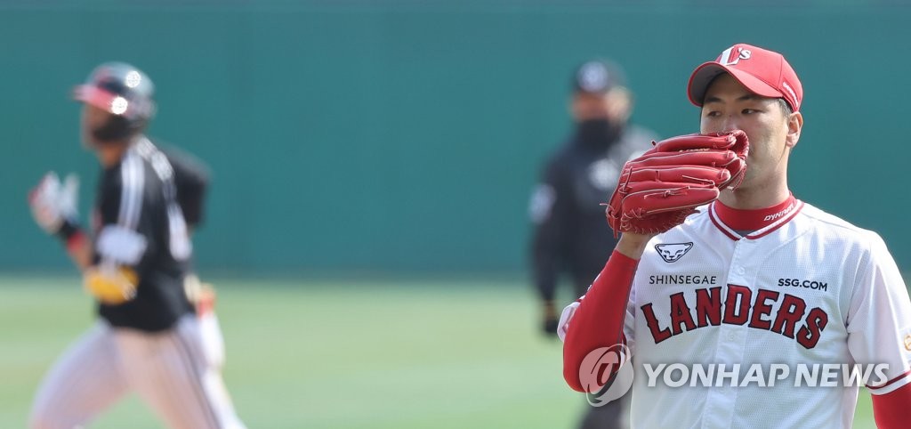 | ▲  Kim Kwang-hyun of the SSG Landers (R) reacts to a home run by Song Chan-eui of the LG Twins in the top of the seventh inning of a Korea Baseball Organization preseason game at Incheon SSG Landers Field in Incheon, 40 kilometers west of Seoul, on March 22, 2022. (Yonhap) |