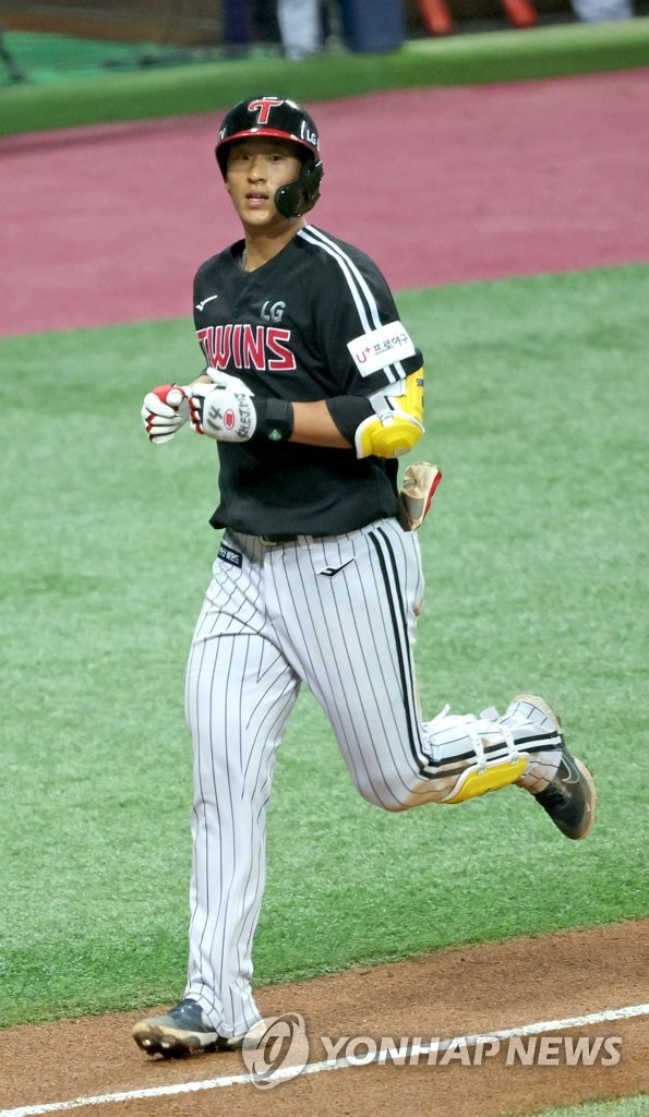 | ▲  In this file photo, Song Chan-eui of the LG Twins comes home after hitting a solo home run against the Kiwoom Heroes in the top of the eighth inning of a Korea Baseball Organization preseason game at Gocheok Sky Dome in Seoul on March 14, 2022. (Yonhap) |