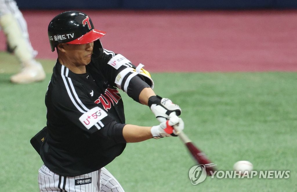 | ▲  Song Chan-eui of the LG Twins connects for an RBI single against the Kiwoom Heroes in the top of the fifth inning of a Korea Baseball Organization preseason game at Gocheok Sky Dome in Seoul on March 15, 2022. (Yonhap) |