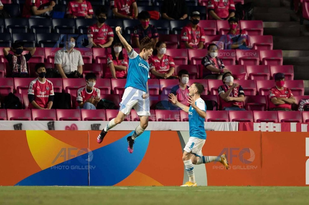 | ▲ Lee Seung-mo of Pohang Steelers (L) celebrates his goal against Cerezo Osaka during the clubs' round of 16 match at the Asian Football Confederation (AFC) Champions League at Nagai Football Stadium in Osaka, Japan, on Sept. 15, 2021, in this photo provided by the AFC. (PHOTO NOT FOR SALE) (Yonhap) |