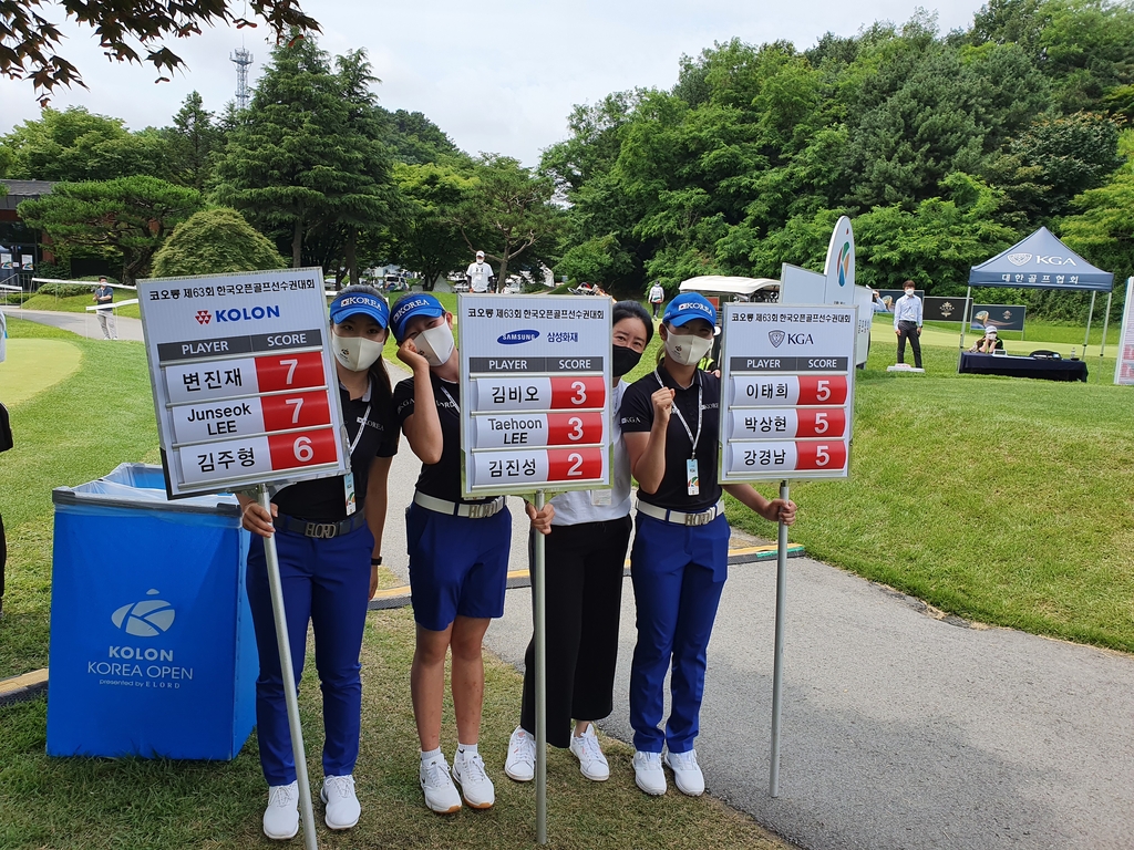 26일 충남 천안의 우정힐스 컨트리클럽에서 열린 코오롱 제63회 한국오픈 3라운드에선 마지막 3개 조에 이동식 스코어보드가 운영됐는데, 현재 여자 국가대표인 이지현(19·서울컨벤션고), 방신실(17·비봉고), 이정현(15·운천중)이 자원봉사에 나서 이 보드를 들었다.