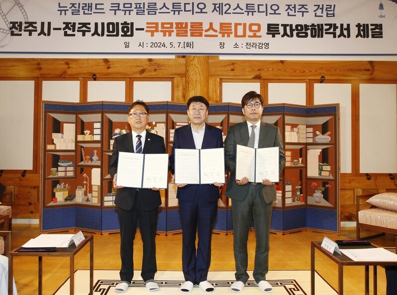 우범기 전주시장과 이기동 전주시의회 의장, 피터 유(유성환) 쿠뮤필름스튜디오 대표는 7일 전라감영에서 '쿠뮤필름스튜디오 제2 스튜디오 전주 건립을 위한 투자 양해각서'를 체결했다.