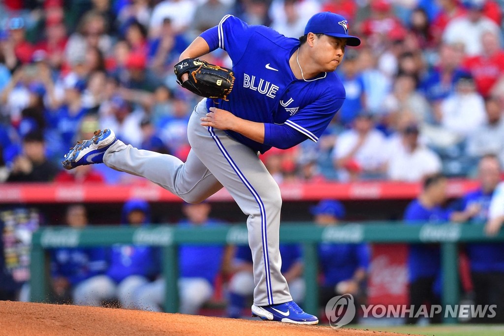 | ▲ '미니 한일전'서 역투하는 토론토 류현진 (애너하임 USA TODAY=연합뉴스) 미국 메이저리그(MLB) 토론토 블루제이스의 류현진(35)이 26일(현지시간) 캘리포니아주 애너하임의 에인절스 스타디움에서 열린 로스앤젤레스 에인절스와의 경기에서 1회 투구를 하고 있다. 토론토와 로스앤젤레스는 이날 각각 한국의 류현진과 일본의 오타니 쇼헤이(27)를 선발투수로 내세워 '미니 한일전'이 성사됐다. 2022.5.27 alo95@yna.co.kr |