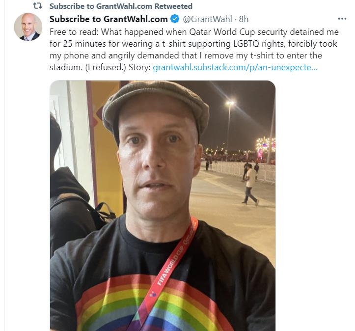 (서울=연합뉴스) 이의진 기자 = 성 소수자를 지지하는 의미에서 '무지개색 티셔츠'를 입은 미국 기자가 카타르 월드컵 경기장에 들어가지 못하는 일이 생겼다.