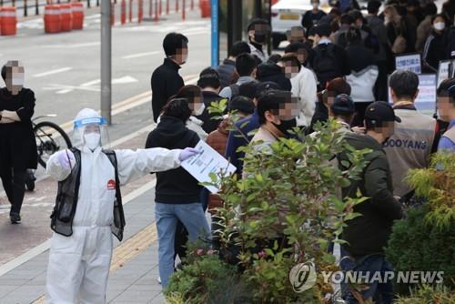 | ▲ A medical worker (2nd from L) helps people line up for virus tests at a screening center in southeastern Seoul on Oct. 31, 2021, one day before South Korea's first step to get back to normalcy takes effect. (Yonhap) |