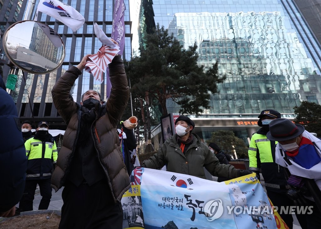 한편 일부 단체는 일본대사관 앞에서 일장기가 그려진 종이를 찢기도 했다.