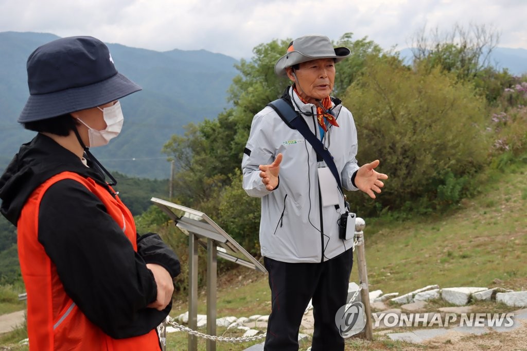 | ▲ 70년 만에 민간에 개방된 인제 DMZ 평화의 길 (인제=연합뉴스) 전쟁의 상흔과 분단의 아픔이 서린 강원 인제군 비무장지대(DMZ) 평화의 길이 70여 년 만에 정식으로 민간에 개방된 14일 관광해설사가 DMZ와 얽힌 역사와 생태 관련 이야기를 설명하고 있다. 2022.9.14 [설악금강서화마을 제공. 재판매 및 DB 금지] conanys@yna.co.kr |
