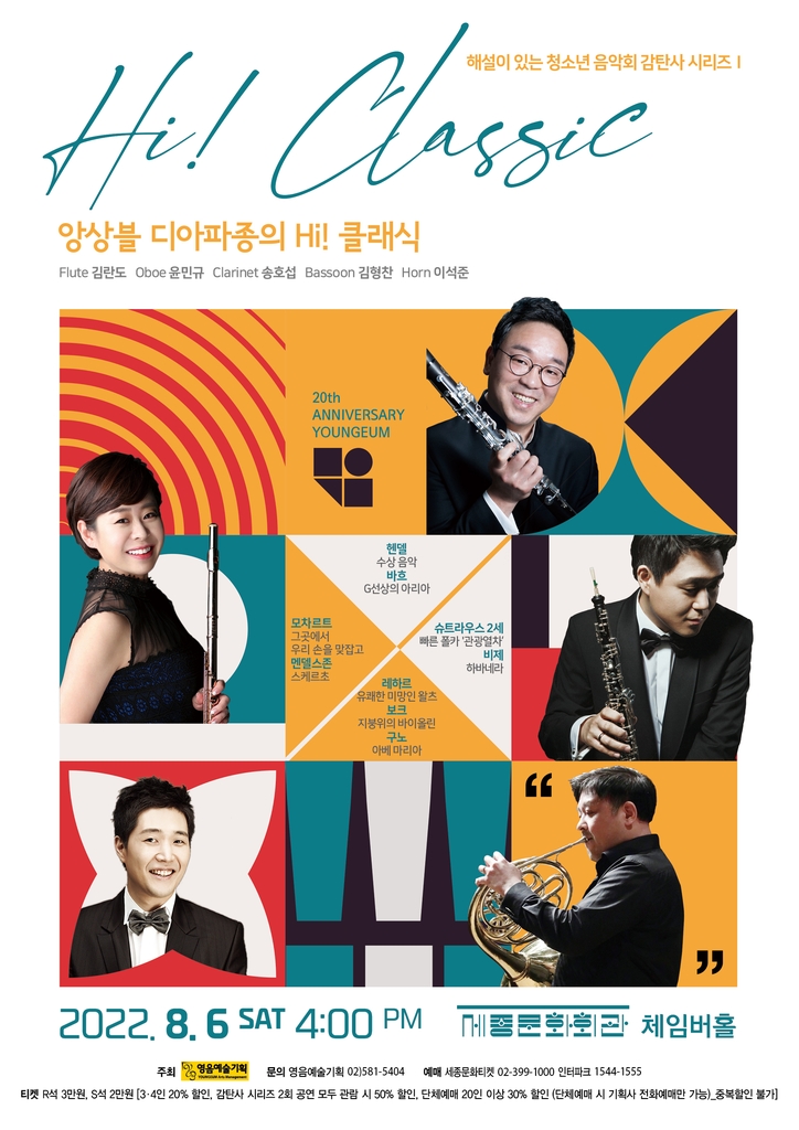 6일에는 앙상블 디아파종이 헨델, 바흐, 모차르트, 멘델스존 등의 곡을 연주하고 해설하는 'Hi! 클래식' 공연을 연다.