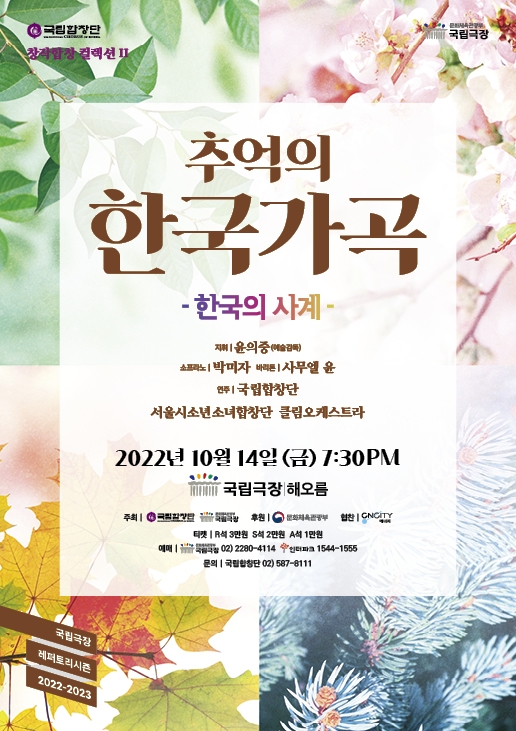 ▲ 국립합창단 '한국의 사계 - 추억의 한국가곡' = 국립합창단은 내달 14일 국립극장 해오름극장에서 '한국의 사계 - 추억의 한국가곡' 공연을 연다.