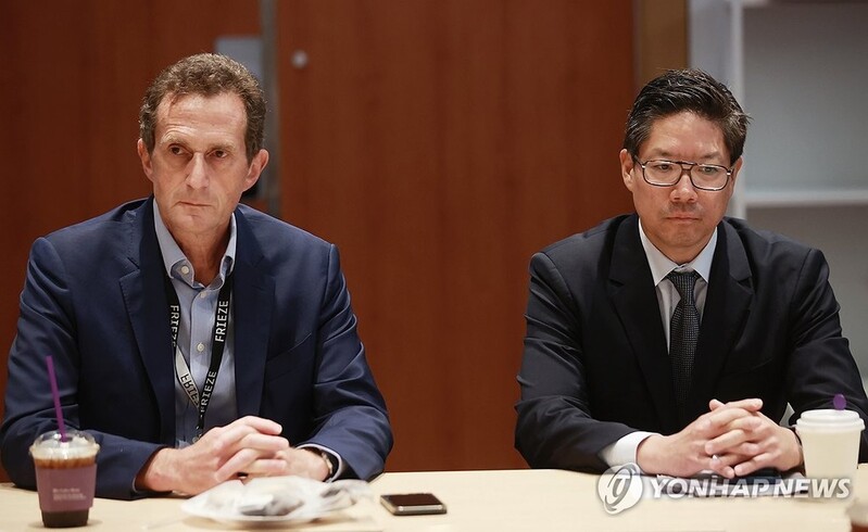 | ▲ 사이먼 폭스 프리즈 CEO와 패트릭 리 디렉터 (서울=연합뉴스) 진연수 기자 = 7일 오후 서울 강남구 코엑스에서 사이먼 폭스 프리즈 CEO(왼쪽)와 패트릭 리 프리즈서울 디렉터가 취재진의 질문을 듣고 있다. 2023.9.7 jin90@yna.co.kr |