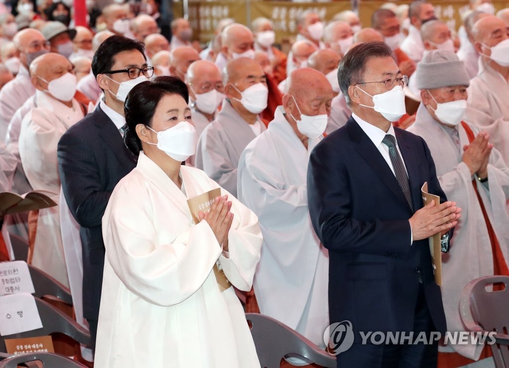文대통령, 현직 대통령 첫 참석…종정과 나란히 입장해 끝까지 자리 지켜
