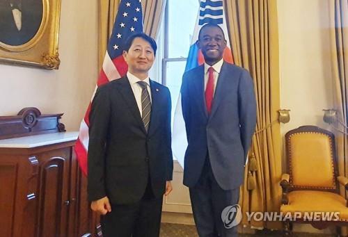 | ▲ South Korean Trade Minister Ahn Duk-geun (L) poses for a photo with U.S. Deputy Treasury Secretary Wally Adeyemo during their meeting in Washington on Dec. 8, 2022, in this photo released by the trade ministry. (PHOTO NOT FOR SALE) (Yonhap) |