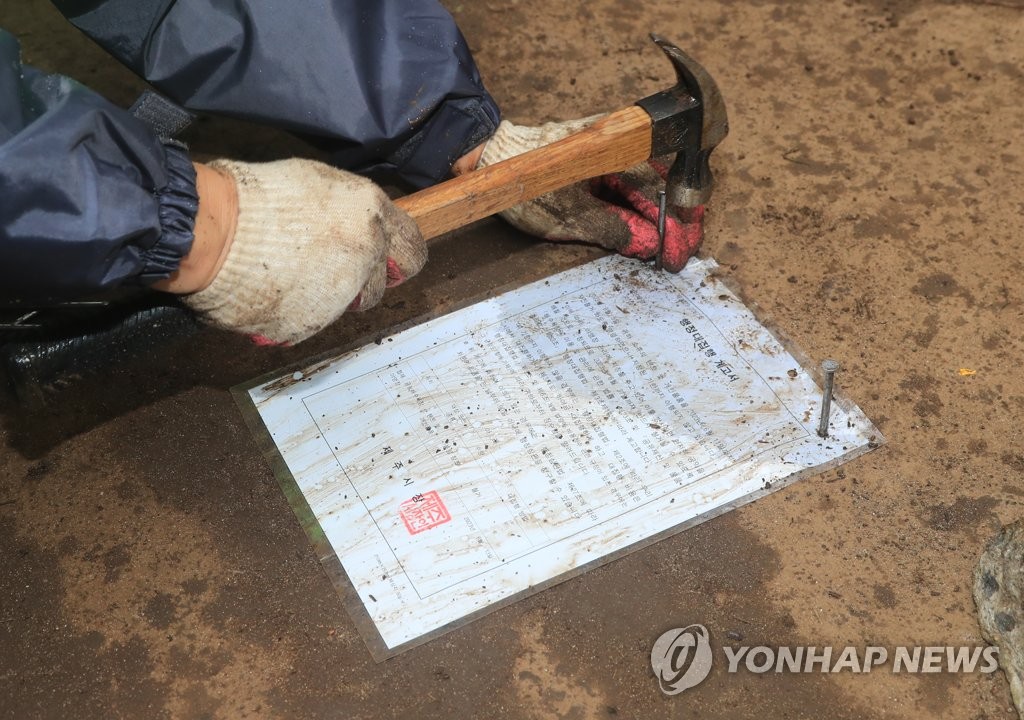 | ▲ '알박기' 텐트 철거된 자리에 (제주=연합뉴스) 백나용 기자 = 30일 오후 제주시 관계자 등이 제주시 협재해수욕장과 금능해수욕장 사이 녹지 지역에 있는 '알박기' 텐트를 강제 철거하고 텐트가 있던 땅에 행정대집행 계고장을 못으로 박고 있다. 협재·금능 해수욕장 야영장은 시민과 관광객이 효율적으로 사용할 수 있도록 7월 1일부터 8월 31일까지 지역 청년회에 위탁해 한시적으로 유료 운영된다. 2023.6.30 dragon.me@yna.co.kr |