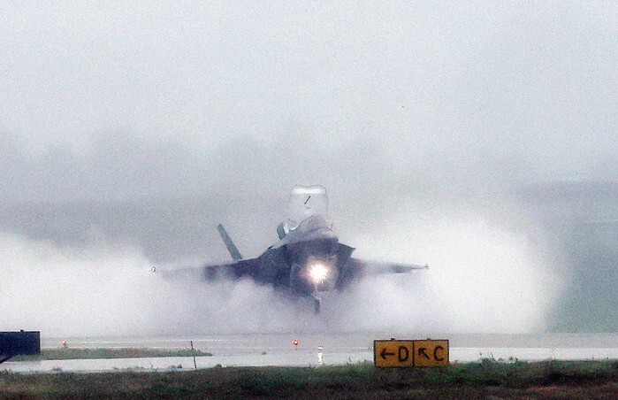 An F-35B stealth fighter of the U.S. military lands at the U.S. Osan Air Base in Pyeongtaek, south of Seoul, on May 9, 2025, as the U.S. Air Force holds a preview of the 2025 Air Power Day that will run from May 10-11. Osan Air Base -- home to the U.S. 51st Fighter Wing -- last held the air show in 2019 before it was halted due to the COVID-19 pandemic. (Yonhap)