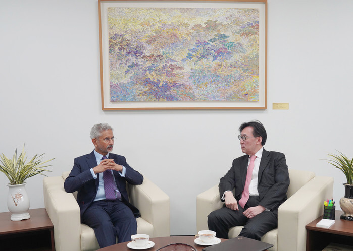 South Korean National Security Adviser Chang Ho-jin (R) talks with Indian Foreign Minister Subrahmanyam Jaishankar at the presidential office in Seoul on March 5, 2024, in this photo provided by the office. (PHOTO NOT FOR SALE) (Yonhap)