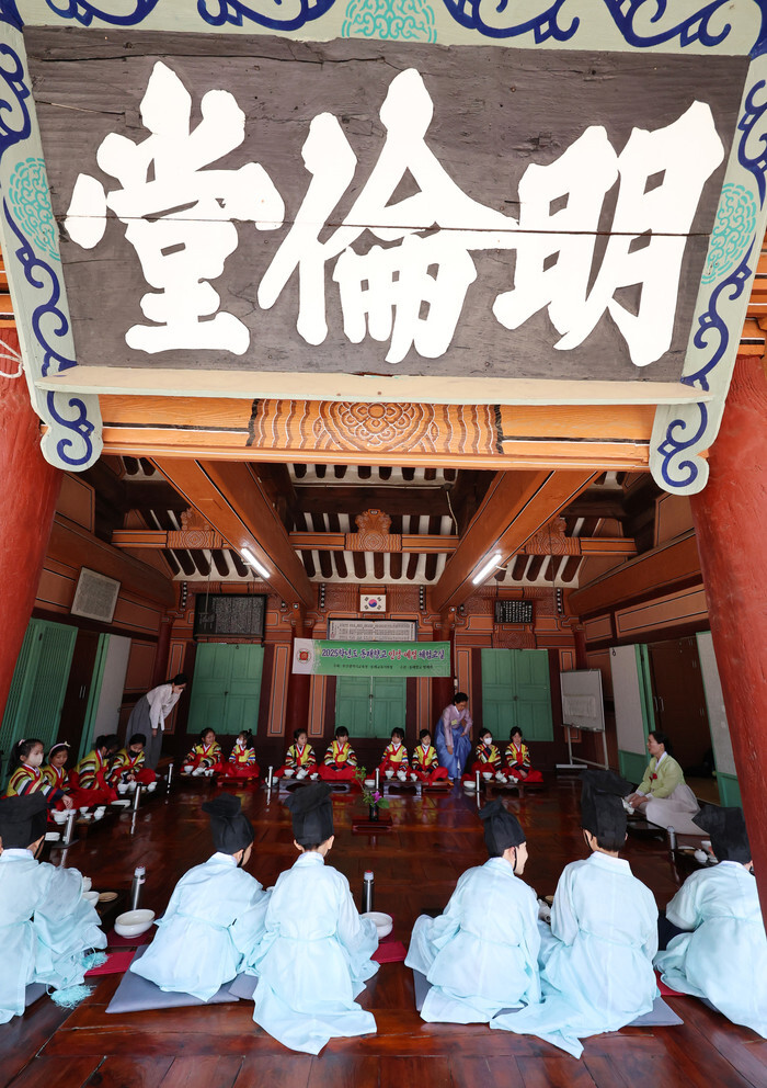 Children dressed in traditional clothes take part in an event to learn traditional etiquette at Dongrae Hyanggyo, a public education institute established during the 1392-1910 Joseon Dynasty, in the southeastern port city of Busan on May 7, 2025. (Yonhap)