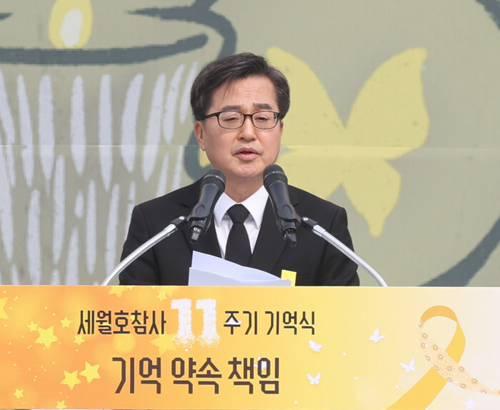 Gyeonggi Gov. Kim Dong-yeon delivers a eulogy during a memorial service in Ansan, south of Seoul, on April 16, 2025, to pay tribute to the victims of the sinking of the ferry Sewol off Jin Island on South Korea's southwest coast, as the country marked the 11th anniversary of the 2014 deadly sinking of the ferry that claimed more than 300 lives, mostly teenagers on a school excursion. (Pool photo) (Yonhap)