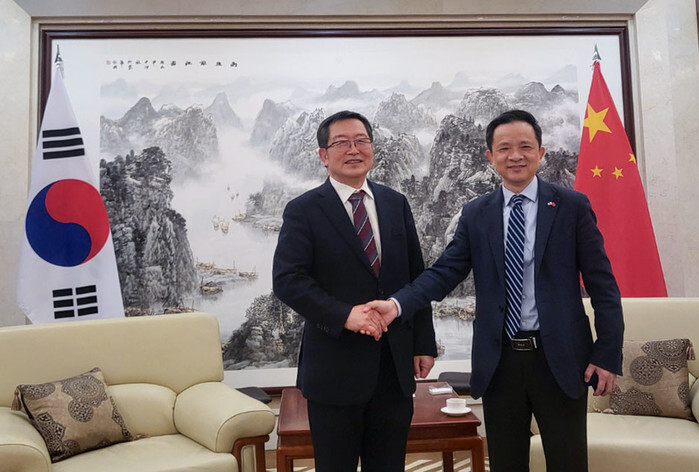 Baek Seung-joo (L), president of the War Memorial of Korea, poses for a photo with Chinese Ambassador to South Korea Dai Bing during their meeting at the Chinese Embassy in Seoul on March 4, 2025, in this photo released by the agency. (PHOTO NOT FOR SALE) (Yonhap)