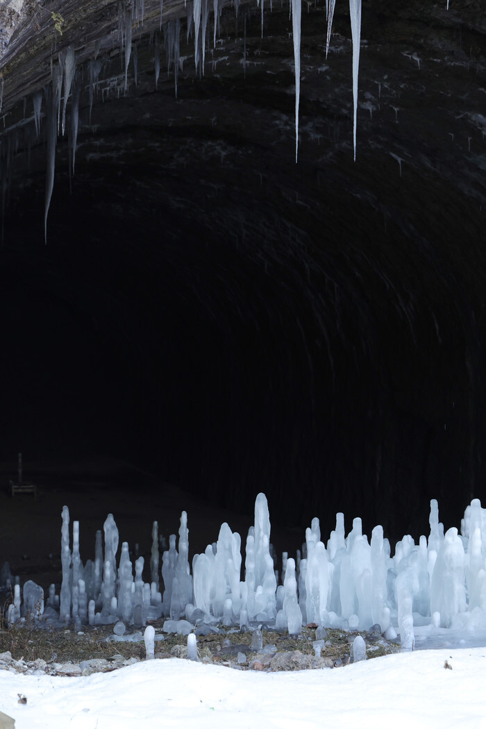This photo, taken on Jan. 2, 2026, shows icicles having formed on the ground at a closed railway tunnel in Yeoncheon, north of Seoul. The icicles were made by water drops falling from the tunnel's ceiling amid a cold snap. (Yonhap)