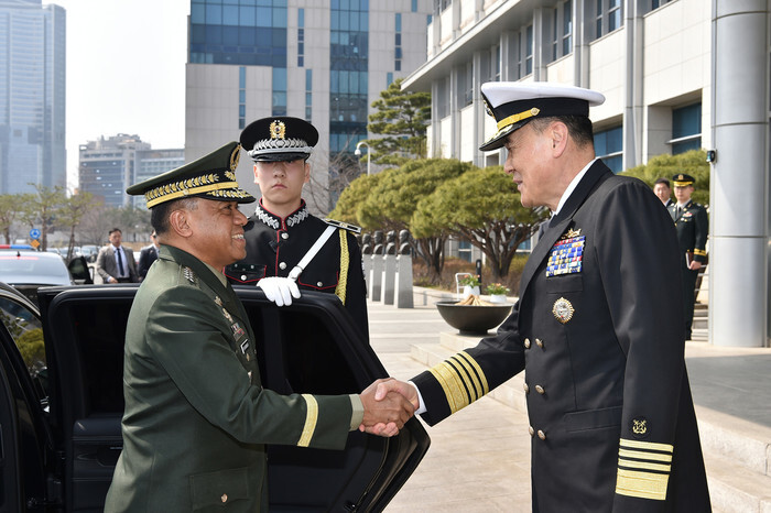Joint Chiefs of Staff (JCS) Chairman Adm. Kim Myung-soo (R) greets his Filipino counterpart, Gen. Romeo Brawner Jr. (L), before their talks in Seoul on March 24, 2025, in this photo provided by the JCS. (PHOTO NOT FOR SALE) (Yonhap)