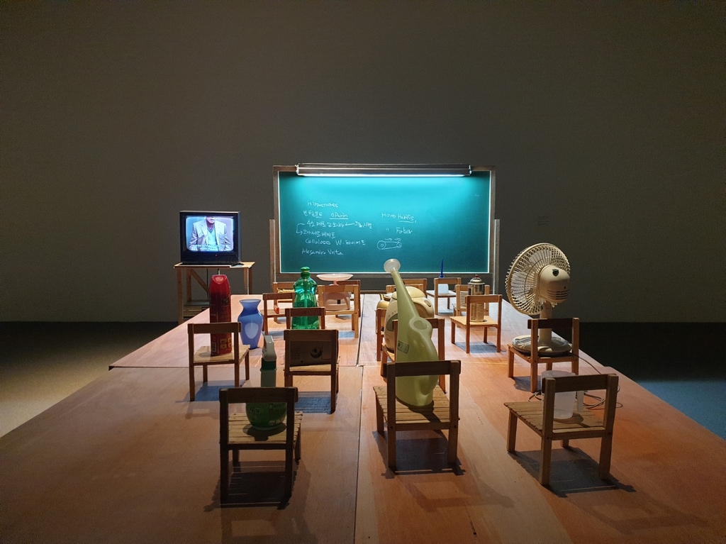 '교육된 사물들' 연작은 제목 그대로 사물들을 대상으로 교육하는 모습을 표현한 작업이다. '정지용의 시를 배운 돌'에서는 돌을 앞에 놓고 비디오 속 강사가 정지용의 시를 가르치고 '자신이 새라고 배운 돌'에서는 역시 나뭇가지 위에 올려진 돌을 두고 강사가 끊임없이 나는 법을 설명한다. 교육을 통해 대상에 의미가 담기고 세상을 바라보는 틀이나 시각이 달라질 수 있음을 이야기하는 작업이다.