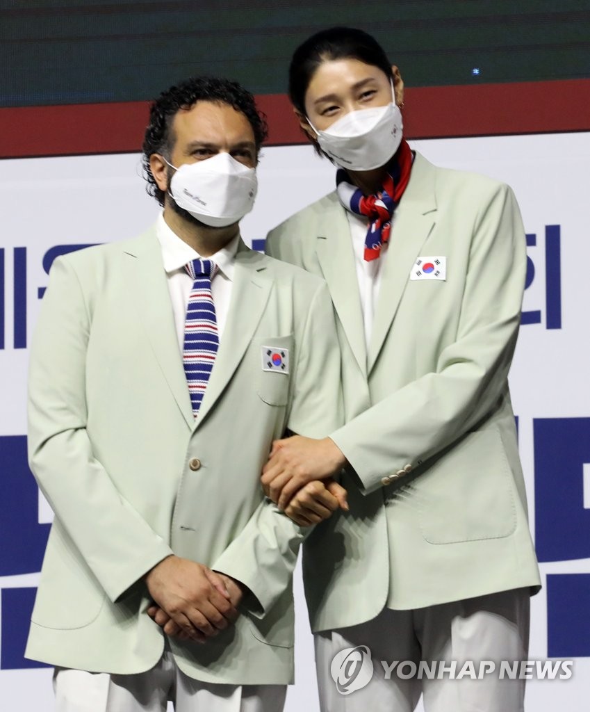 ▲ Stefano Lavarini (L), head coach of the South Korean women's national volleyball team, and Kim Yeon-koung, a member of the team, pose for photos during the launching ceremony for the South Korean delegation for the Tokyo Olympics at the Olympic Park in Seoul on July 8, 2021. (Yonhap)
