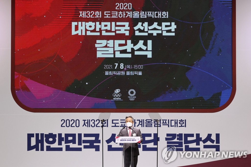 ▲ Lee Kee-heung, head of the Korean Sport & Olympic Committee, addresses South Korean Olympic athletes during a delegation launching ceremony at the Olympic Park in Seoul on July 8, 2021. (Yonhap)