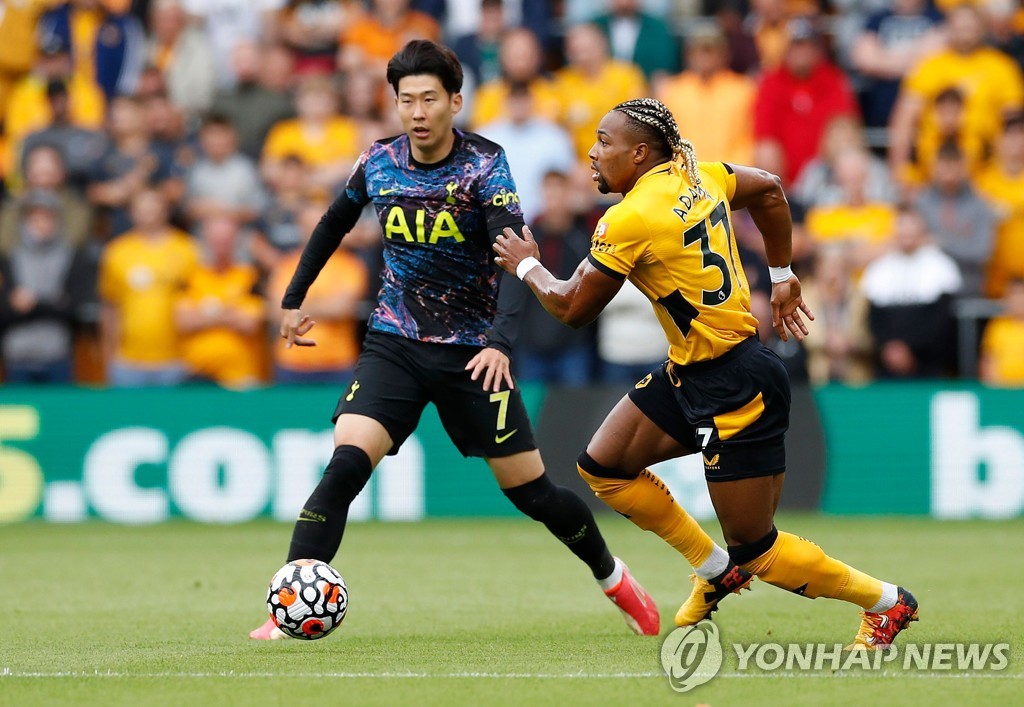 | ▲ In this Action Images photo via Reuters, Son Heung-min (L) of Tottenham Hotspur dribbles the ball during a Premier League match against Wolverhampton Wanderers at Molineux Stadium in Wolverhampton, England, on Aug. 22, 2021. (Yonhap) |