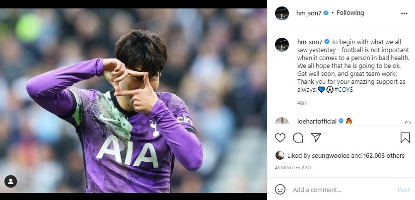 손흥민은 18일(한국시간) 인스타그램에 "어제 경기에서 벌어진 사건을 돌이켜보면, 축구는 사람의 건강보다 중요하지 않다는 걸 알 수 있다. (쓰러진) 관중이 건강을 되찾기를 바란다"고 적었다.