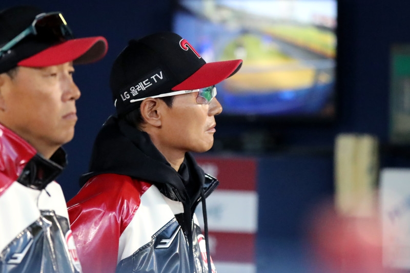 | ▲ LG Twins manager Youm Kyoung-youb (R) watches his team in action against the Samsung Lions during a Korea Baseball Organization regular season game at Jamsil Baseball Stadium in Seoul on April 8, 2023, in this photo provided by the Twins. (PHOTO NOT FOR SALE) (Yonhap) |