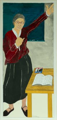 The result is a selection of bold and colorful paintings of these women, who sometimes pose with resolute faces and a missing finger -- Nam Ja-hyeon (1872-1933) who fought at the front lines of the independence army is known to have sent a blood-stained letter to Japanese leaders along with her severed finger -- or an educator who raises one arm in an ambitious gesture for her students.